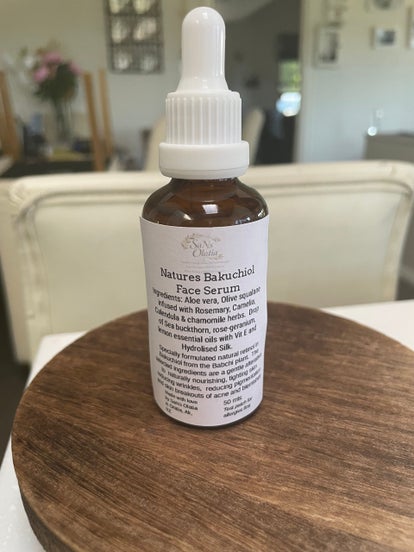 Serum from natures best aloe Vera, chamomile flowers and infused rose petals. Bakuchiol has the same anti-inflammatory and anti-acne properties as retinol. It can unclog congested pores and reduce irritation in your skin to help prevent acne breakouts. Bakuchiol can also shrink your pores. Enlarged pores trap bacteria, dirt, and debris more easily.